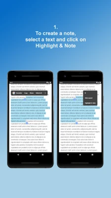 When a text is highlighted, click on the options menu of copy - paste bar as in the screenshot pictures and select the Highlight & Note app to create a new note of the selected text or to add the selected text to a previous note.